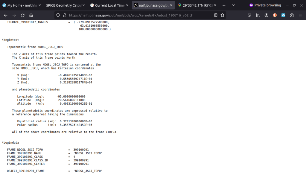Step 8: “Frame name” is set to Johnson Space Center, NDOSL_JSCJ_TOPO. The output that we are looking for, discussed soon, requires the coordinates be centered at the observer’s location.