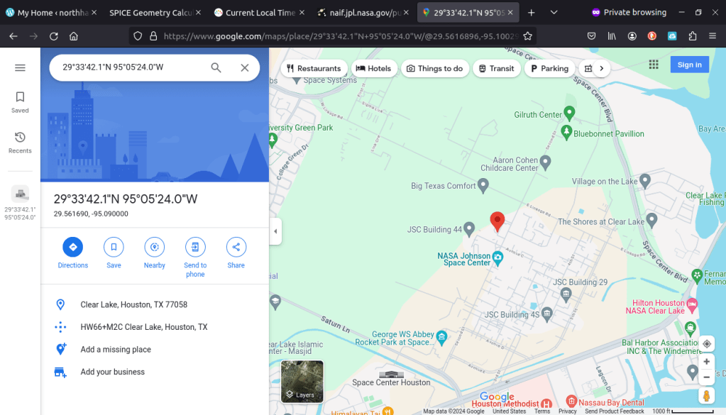 To double check that the provided Longitude and Latitude correspond to NASA Johnson Space Center, these can be fed into google maps.