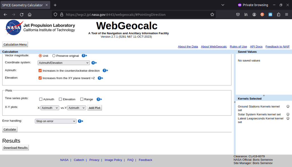 Step 1: Skip the “Kernel selection”. These are information packages that the code looks into for detailed information. If you look in the box to the bottom right, you’ll see “Ground Stations”, “Solar System”, and “Latest Leapseconds”. That’s all you need