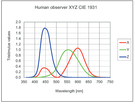 There is one more color filter to consider: the human eye (Figure 3). While image analysis involves techniques to address the previous discussion, it is important to be aware that the colors humans see similarly passes through filters, namely the color receptors in our eyes. The colors that we perceive frequently are mixes of other colors. This is something we already know with our black-magenta-yellow-cyan printers: yellow and cyan mixed together produce green. So a particular color that we see, as opposed to measure with a spectrometer, may not be a pure color at a specific wavelength. Rather it may be a blend of other colors.